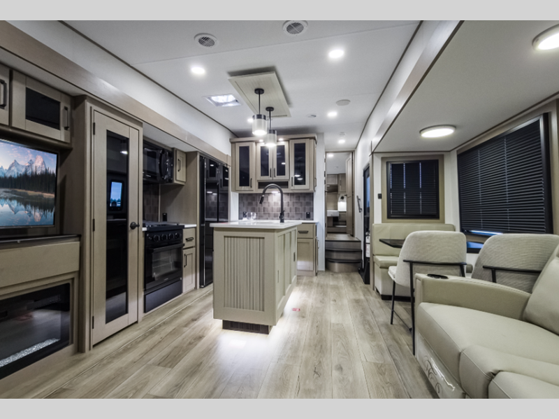 Sleeps 5 Slides 3 Length 34 ft 9 in Ext Width 8 ft Ext Height 12 ft 6 in Hitch Weight 2200 lbs GVWR 13995 lbs Dry Weight 11100 lbs Fresh Water Capacity 74 gals Grey Water Capacity 94 gals Black Water Capacity 47 gals Tire Size ST235/80R16RLE Furnace BTU 35000 btu Available Beds Queen Refrigerator Type 12V Refrigerator Size 16 cu ft Cooktop Burners 3 Shower Size 30" x 48" Number of Awnings 2 LP Tank Capacity 30 lbs Water Heater Type On Demand Tankless AC BTU 15000 btu TV Info LR 40" TV Awning Info 16' & 10'6" One-Touch Electric LED Axle Count 2 Washer/Dryer Available Yes Number of LP Tanks 2 Shower Type Standard Electrical Service 50 amp Solar Wattage 370 watts Similar Floorplans